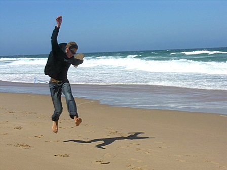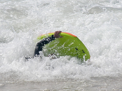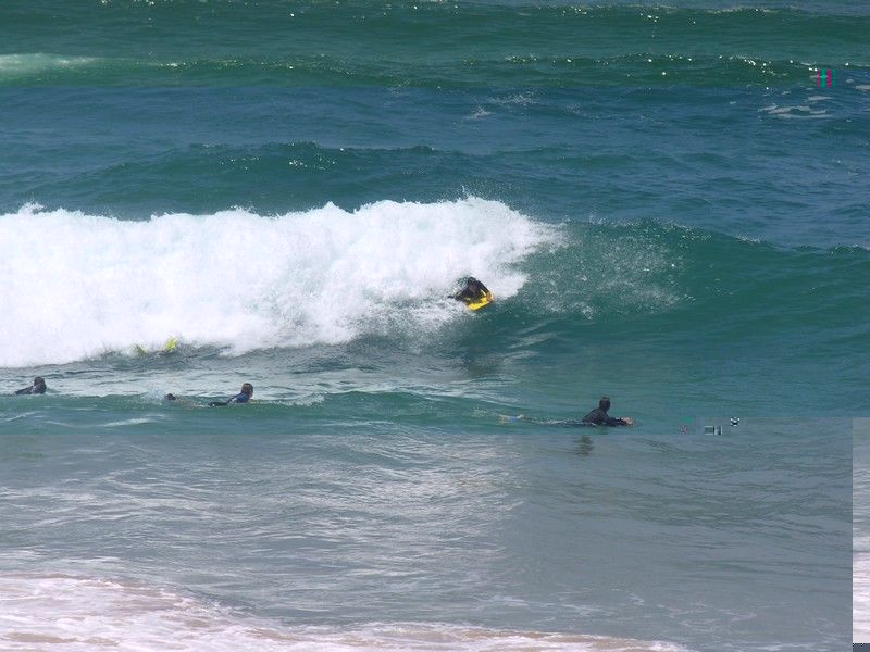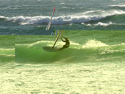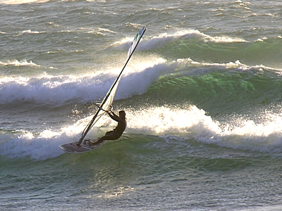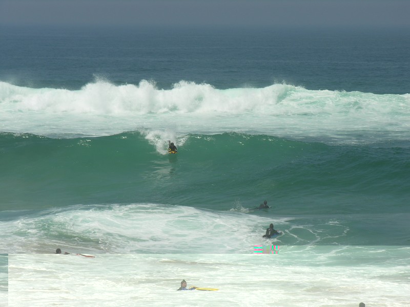 Pabandziau bodyboarda, kankyne, reikia daug vargti, kad dasikasti iki tu dideliu kalnu, nors jie ir visai netoli. Irkluoji rankomis, maskatuoji kojomis su lastais kokia 10-20 min., dar reikia pranerti apie 10 putu kalnu ir bangu, nes kitaip vel krantas. Po sio vargelio per keliolika sekundziu is pradziu paselusiai lekdamas, paskui putu kalatojamas atsiduri krante. Per valanda tik viena karta pavyko nulekti nuo trimetrinio kalno. Murkdymasis prie kranto visai nepatiko, visiskai tas pats, kas nukritus musoje skalbtis su inventorium, nezinau, gal kam ir patinka, man per daug surus vanduo, o skalbyklos ir buriuojant uztenka. Vienu zodziu, bodyboardinimo reikia rimtai mokytis, kai geros bangos. Geriausiai vakar dienos salygas atspindi sio kelios nuotraukos.