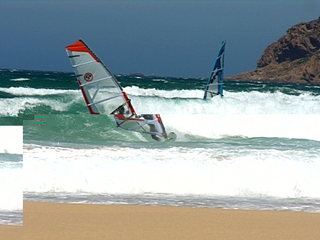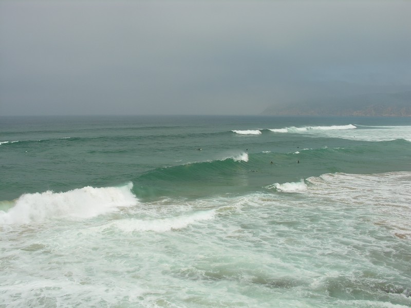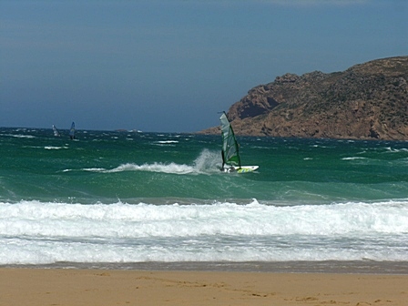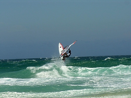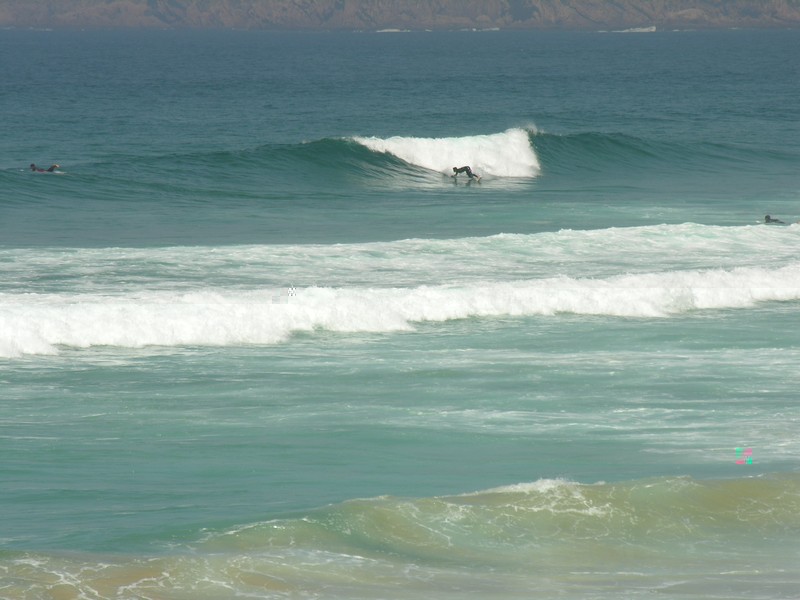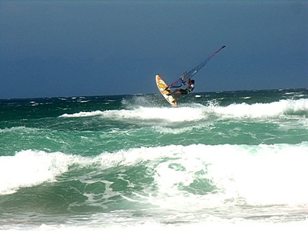 Trumpai apie bangas ir plaukimo salygas. Dazniausiai kai pucia buna apie 12m/s ir 1.5-2 m banga. Bangu dydis priklauso ir nuo potvynio-atoslugio. Dvi dienas gavom netipinio vejo - viena buvo apie 20-25m/s, neplaukiau, nes oro linijos porai dienu pradangino inventoriu, nors su 4.0m2 bure, kazin ar ka buciau isstenejes. Ta patvirtino antras kartas kai pustelejo 18-20 m/s ir prie 3 metru bangos, su keturiais buvo isgyvenimo "varzybos", nors nemazai prasikalusiu idealiai raidino, vienoj bangoj padarydami po 4-6 cutbackus. Prie vietiniu salygu reikia adaptuotis. Visos gana ilgos luztancios einancios dazniausiai po tris su 6-8 sekunciu trapias bangos yra arti kranto, atstumu apie 60-100 metru. Toliau jurinis bangavimas, kaip ir visur kitur. Isplaukimas nera lengvas, nes prie kranto, luztanciose bangose, vejas kartais zenkliai silpnesnis, nei uz bangu. Praktiskai varai tiesiai i stacia banga, tarp bangu tarpu beveik nera. Su minimum vejo turi uzlipti i nemenka kalna arba tiesiog ji pramusti. Po to, jei nesuskalbe, norisi daug mazesnes bures. Kazkiek panasu kai Akiny reikia startuoti "troleibusu parke". Kai pilnai isijungia siaurine kryptis vejas tampa visur vienodesnis, isplaukima neproblematiskas, tik viska reikia daryti labai greitai, nes kiek isibegeji ir is karto gauni banga visu grazumu. Dar neiprasta tai, kad veiksmas prasideda 16.00-17.00 val arba dar veliau, kai pilnai isijungia siaure ar siaures vakarai. Veiksmo pabaiga 21.00 arba dar veliau, kai nebelieka jegu, ir zveriskai norisi valgyti. Nors nuo ryto kartais stabiliai pucia 10m/s vakarai su siek tiek siaures, burlenciu vandenyje nera, tik keli kaitai.
