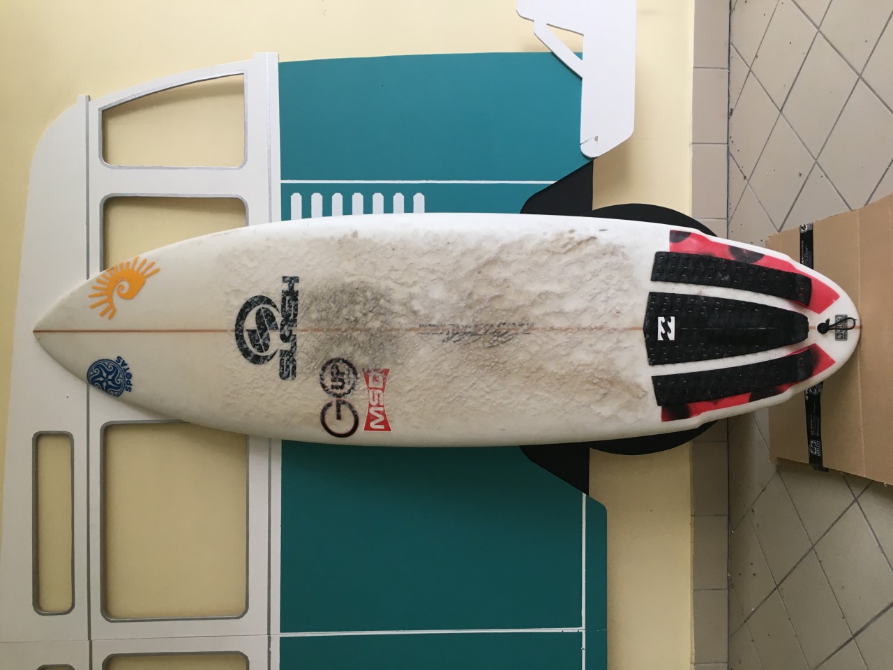 Komentaras: Lenta gaminta pagal custom duomenis man pačiam (95 kg), naudojau kaip pagrindinę lentą Baltijai ir mažoms bangoms kitur. Pora vietų paremontuotų, nieko esminio, stovis geras.