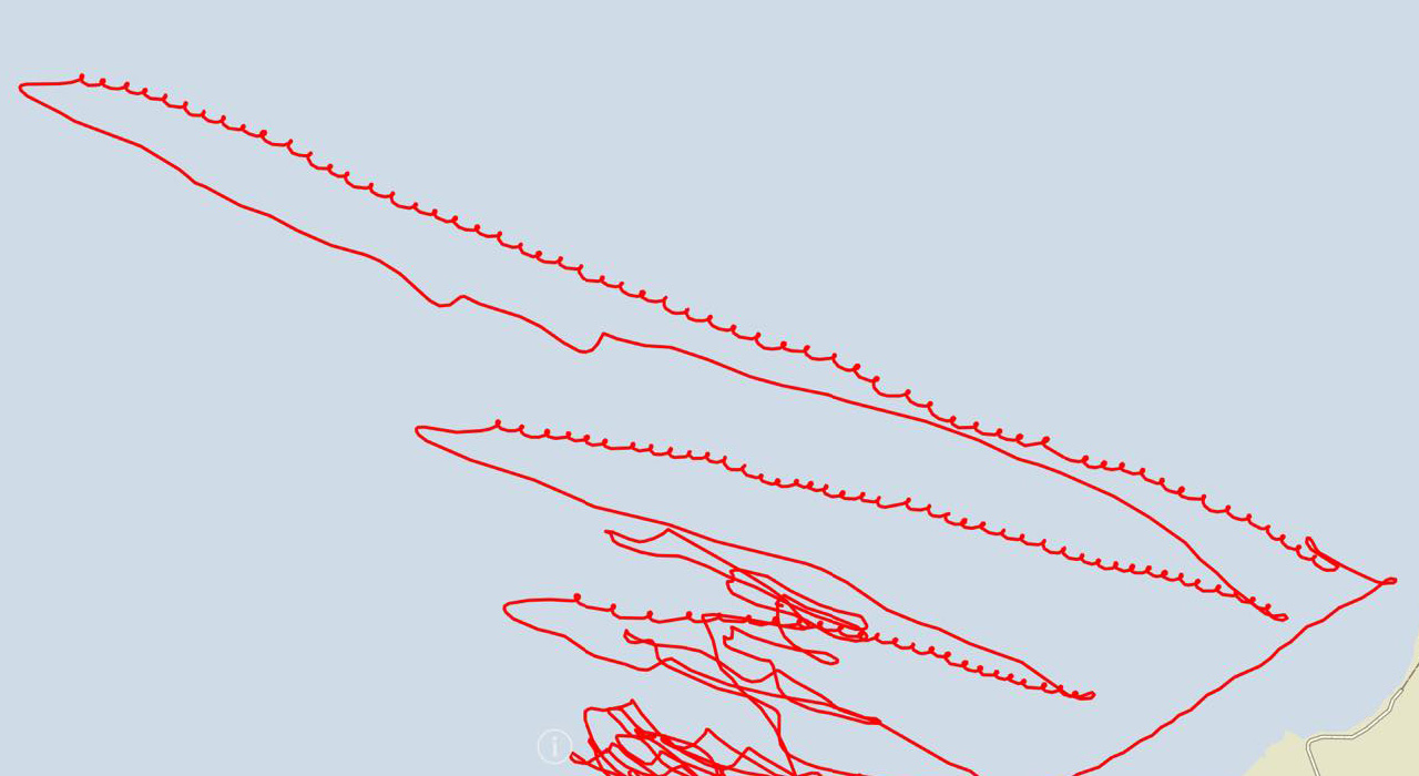 Čia šviežias vieno FLYSURFER'iu ride'inančio žmogaus (ne vietinio, bet europiečio ;)) track'as. Kas galėtų visiems paaiškinti, kaip čia tos "bangelės" gavosi :)?