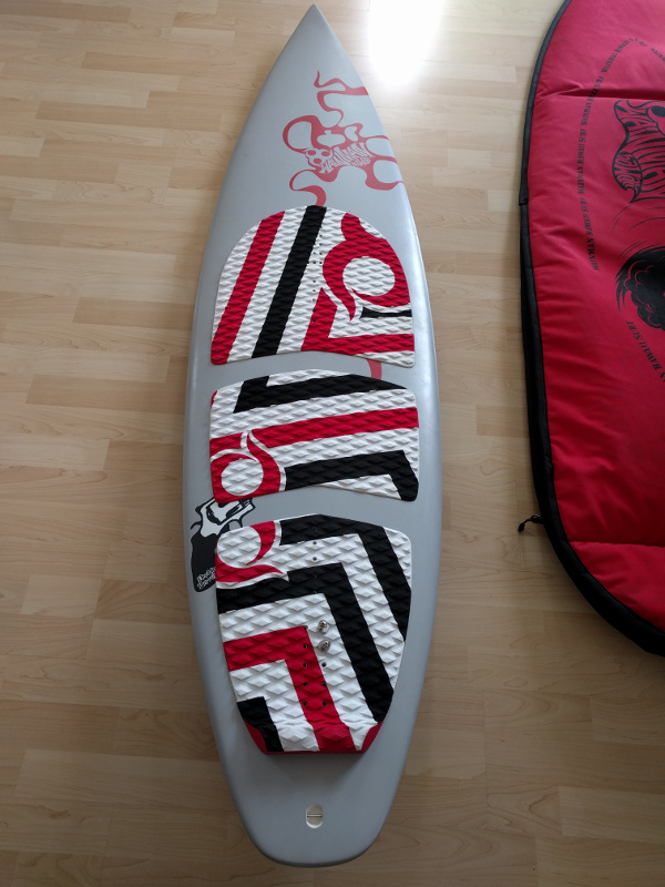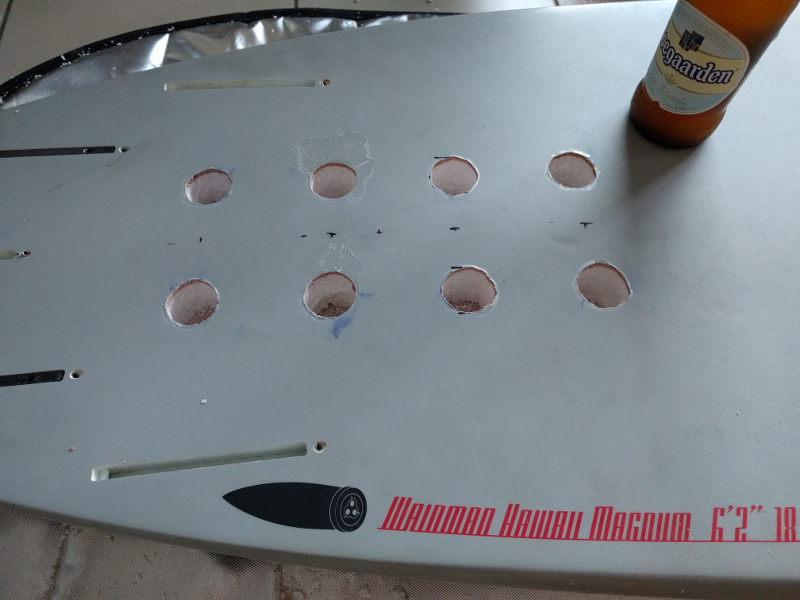 Ką veikti kai savaitgalį nepučia net hidrofoilui? Imam šitą Magnumą, gręžiam skyles nekiauriai iki denio, šlifuojam, pjaustom PVC strypą, pilam į skyles epoksidinę dervą su stiklo burbulais, įstatom PVC strypelius, pilam epoksidinę dervą ir klojam stiklo audinį, dedam formavimo plėvelę. Prispaudžiam. Laukiam. Liko nušveisti, nuglaistyti, nušveisti, nudažyti, išgręžti skyles ir varžtus parinkti. Kas rekomenduosit gerą glaistą, tvirtą ir lengvai apdirbamą?