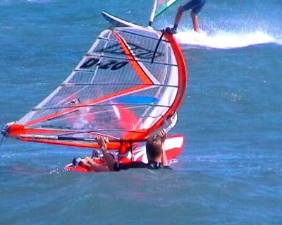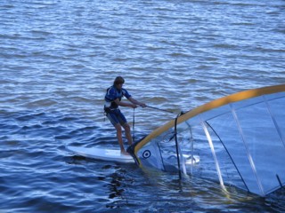Ten ne brezentas, o poliesteris. Buriuotojiškas terminas tam yra "skudurinė burė". Manau, su Mustangu įmanoma padaryti vandens startą, bet tai yra sunku. Mokytis vandens startą Mustangas tikrai ne geriausia platforma. Reikalas tas, kad jo burė kol neuždaryta, labai plevesuoja.