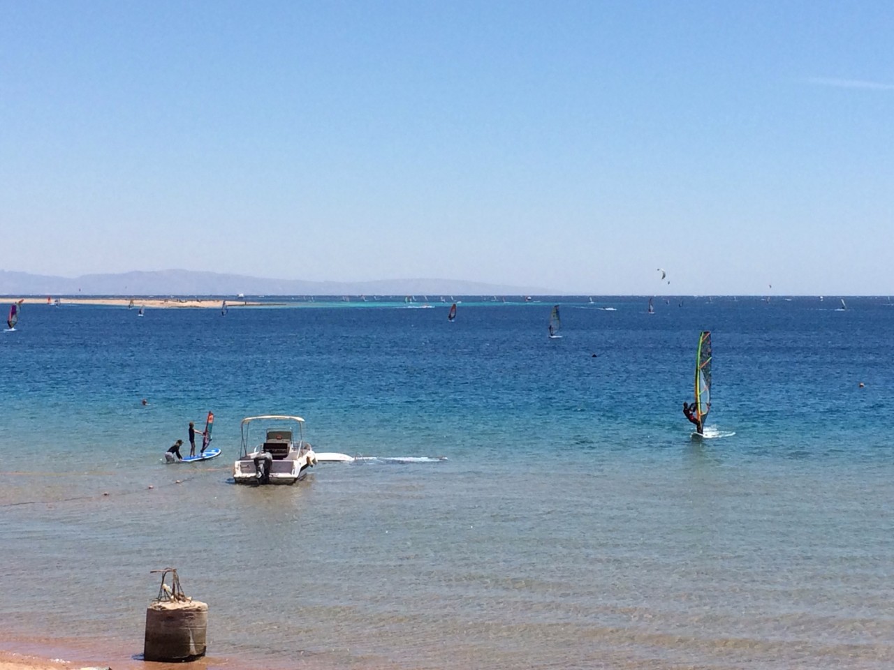 Šią sav gryžome iš kelionės prie silto vandens Dahab, Egipte. Jei kam įdomu, galesiu nupasakot yspudzius gausiau, o cia tik trumpas aprasymas. Taigi siuo metu laiku vandens temperatura buvo 22-23, oro 22-35 oC. Vezemes 5mm hidrokostiumus, nes kitokiu neturime. Jy apsirenges buvau tik karta, o visus kitus kartus devejau tiesiog lycra sleptis nuo ydegio - salta nebuvo, nors plona neoprena uzsimest ant organizmo rekomenduotina. Is 14 prabutu dienu 13 buvau ant vandens yvairu laika. Vejas praktiskai visada stabilios N-NE krypties, laguna ir akvatorija uztverta nuo juros koralinio rifo, jis gerai gesina bangas, nors ciopas vistiek susidormuoja. Zr nuotrauka. Kaitininkai turi ribotas laisves - savo atskira bala, lagunos desineje. Ji sekli, todel atoslugio metu beveik isdziusta  . Pagrindinej lagoonoj ir jos prieigose kaitininka not welcome, zodziu pasidalinta ytakos sferom. Yra gal 6 windsurfing stotys ir nuomos punktai, visokiu lentu ir buriu y valias. Yrangos komplektas savaitei $150-250 ir maziau jei ilgiau, instruktorius $50 val ir maziau jei ilgiau. Maistas miestelio restaurantuose geras, ypac tiems smagu, kurie valgo juros vaises. Kainos kaip LT, kartais net gausiau. Dviese per vakara praleidi gal 70-80 LTL su shisha paputimu. Daznai persivalgydavom, nors kaskart sakem, kad kita vakara taip nebus  Viso nuplaukiau ~130 km per 13 dienu, sugeriau puskibiry ypac druskingo vandens. Atvaziavau patyres tik atsitiktiny glisa Kursmarese, kilpose nebuvau stovejes, ant trapes buvau pakibes pora dienu is praeito sezono, taciau to pakako tik keletui kriksto katapultu  Dahab'e gerokai pralavinau balanso su trapecija ygydzius, kabinuosi ja tik pradejes plaukti. Ismokau ylipti ir islipti is kilpu, patyriau kaip glisas prasideda, ka veiki kai jis vyksta ir kaip baigias. Siek tiek pajauciau dalykus, kaip pasirinkti, kontroliuoti ir ismalikyti krypty glise. Praplaukiau non stop glise, kilpose ir ant trapes 1,5 km atstuma vidutiniu 31 kmh ir max 47 kmh greiciu ir labai savim pasididziavau  Reziume: vieta labai vykusi windserfingui, yvairiu lygiu ir siekiu varytojams. Ypac draugiska arbatinukams. Manau per 2 sav pavyko pasistumeti apciuopiamai, tas 2 sav prilyginciau 2 men LT nepastoviu oru salygom, varant savaitgaliais.