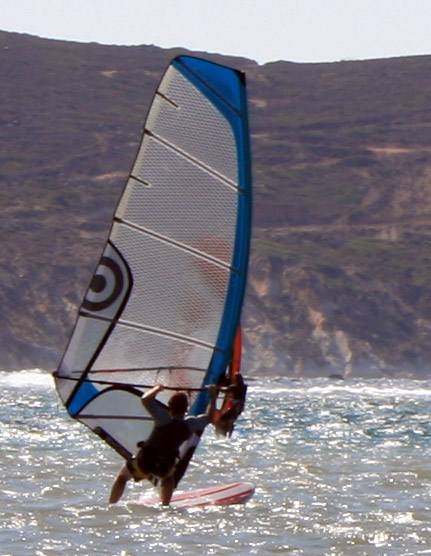 chia ne pats geriausias, bet shioks toks pavyzdys, kaip kabeti ant giko, nekabant ant trapes. Uzhlipus ant lentos per stipru veja lenta momentaliai suka nosi priesh veja, reikia jos nosi nukreipti i halfwinda. Chia nuotraukoje jau prisitraukes, tuoj lipsiu i trape, bet dar geriau kabeti ant beveik tiesiu ranku. Galine ranka labiau uzhtraukta, o priekine labiau tiesi, kad bure labiau "matytu" vejas, priekine koja prie sharnyro, spiria lenta pavejui, galine koja ant pirshtu galu, nespaudzia lentos galo. Fotkeje akivaizdziai matosi, kad galva zhemiau nei gikas, apie ka rasho ir Guy Cribb ( http://www.guycribb.co.uk/userfiles/doc ... 20Link.pdf)