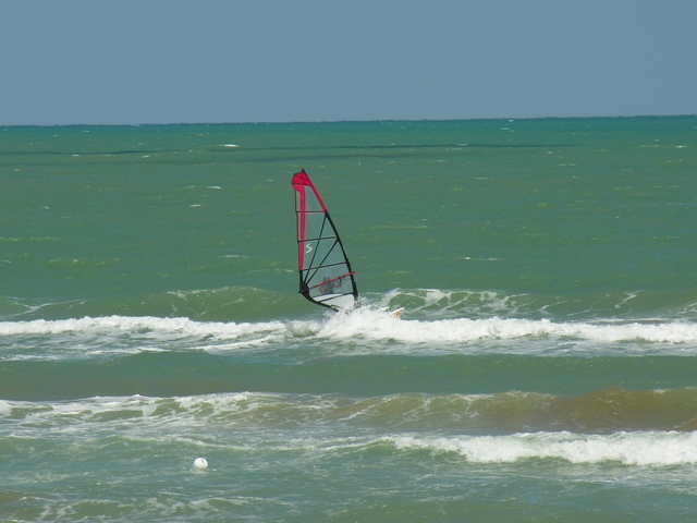na va, po keturiu dienu keliavimo ir blaskymosi po Italijos miestus, kempingus ir autostradas, pasiekeme keliones tiksla. Gargano mus pasitiko karsciu ir raudonais pomidoru laukais. vakarinis brizas nezadejo nieko gero. Vakar ryte atsikele, nusprendem, jog tai plezininku rojus ir mes vis tik ne ten pataikem. bet del viso pikto susitakelavom bures. paskui girdim, jog vietiniai sneka, kad bus dideliu buriu diena. Na, dideles bures, musu supratimu yra 10-12, o pas juos 7-9 m2. taigi visa dienele glise, as su 7,5, Saulius su 7,8, Lukas su 7,0.